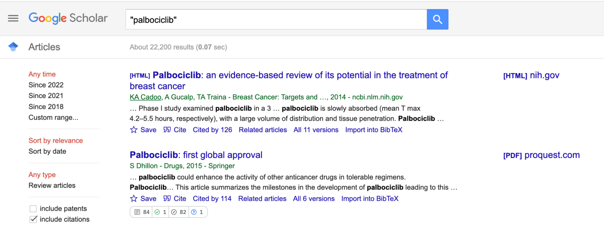 Other tools such as Web of Science, Scopus, or EBSCO, return even less information than Google Scholar, showing only the title and abstract of the matched articles. Seeing exactly how palbociclib has been cited or discussed – for example, to see if there were any adverse events reported – would require you to open all matched articles, which could take hours or days of work.