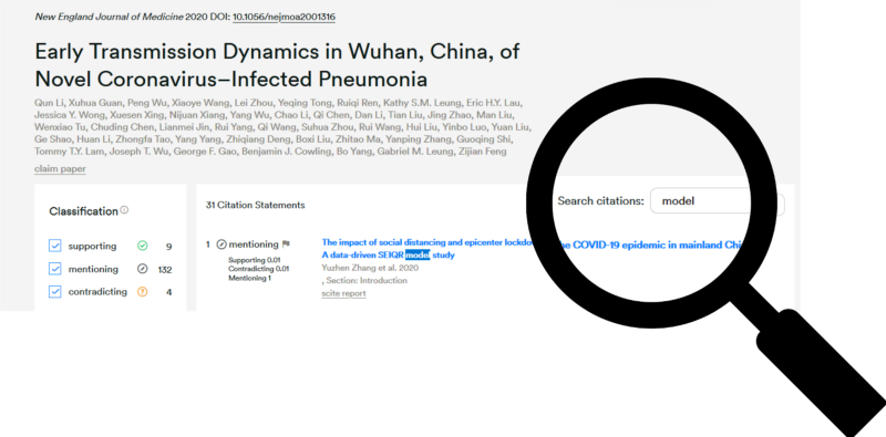 Aside from identifying citations that make a claim about an article, scite offers many other features. Users can search through all citation contexts, authors, and titles using the search field in the top right-hand corner (Figure 2). This can, for example, be useful if researchers want to find other modeling studies using the epidemiological data reported in the NEJM paper. Users can easily find 31 citation statements featuring the word “model” in the title, in the citation context itself or in the section header in the paper where the citation originated from!