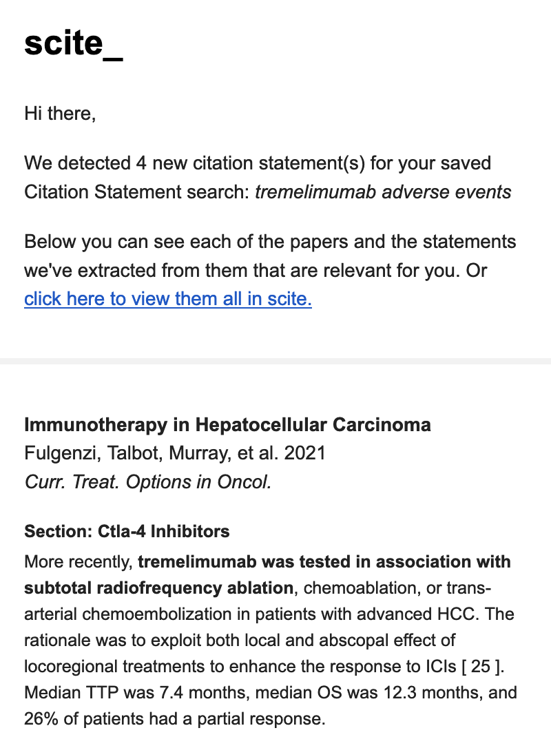 An example email showing new citation statements we detect for a saved Citation Statement search.This is slightly different from the alerts you can configure on our advanced search, which is primarily focused on metadata like titles of papers, abstracts, and such. Instead here, you’re staying up to date based on the content of citation statements themselves!
