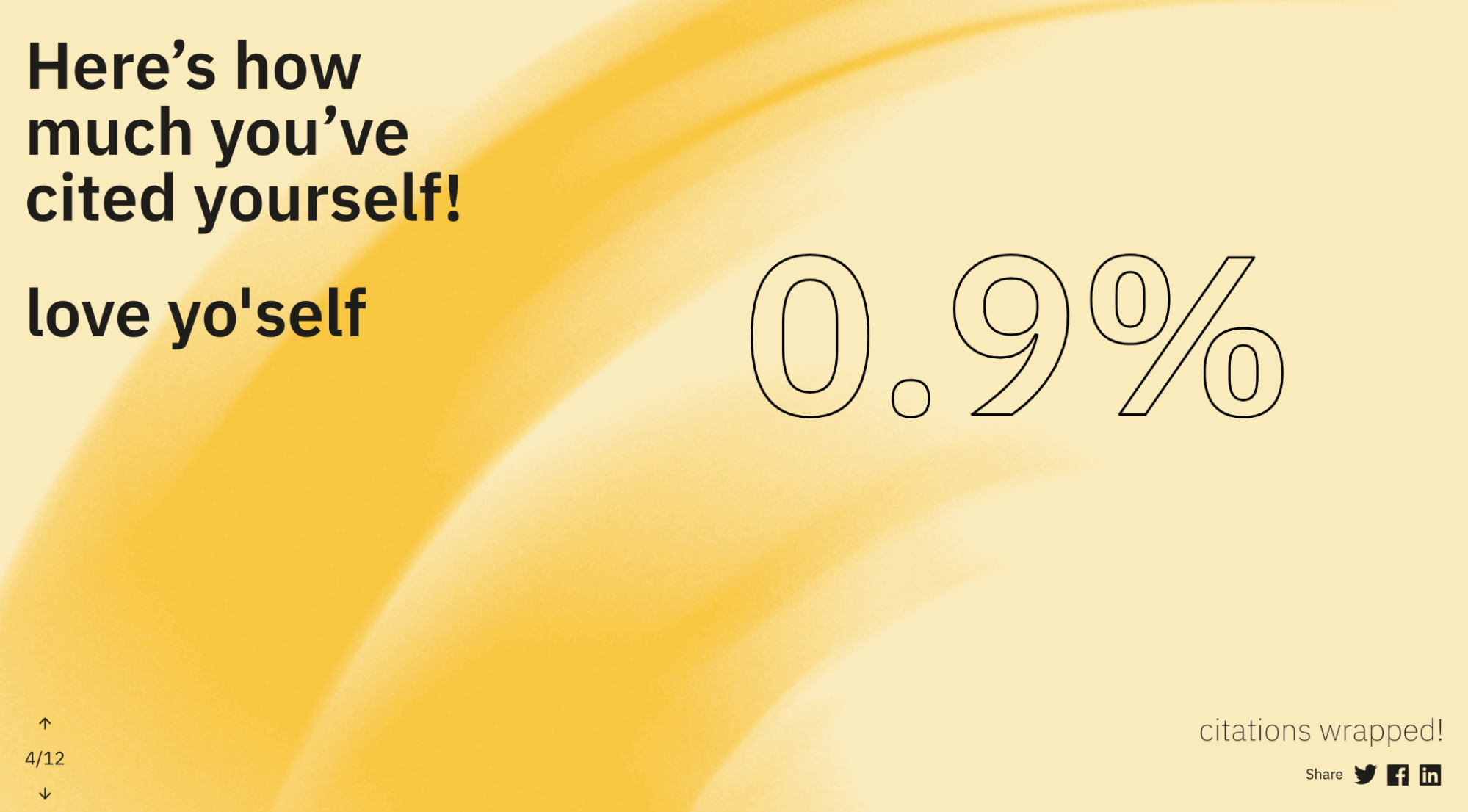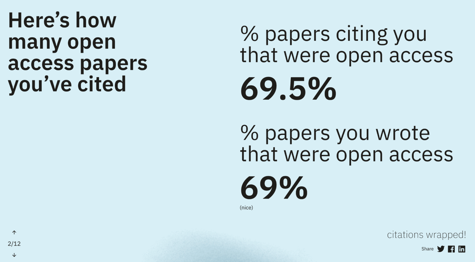Today we are happy to announce the launch of scite digest, a new way to visualize and share key metrics about your work as a published author. scite digest takes inspiration from Spotify Wrapped, an annual initiative from Spotify that allows music listeners to better understand their listening patterns and to share this information socially. scite digest shows authors various metrics about their publications, including the percentage of open access articles they have published, the number of citations they have received and made to preprints, their self-citation rate, which journals they have published the most in, which subjects their articles are under, and other various informative and fun metrics about their writing behavior.