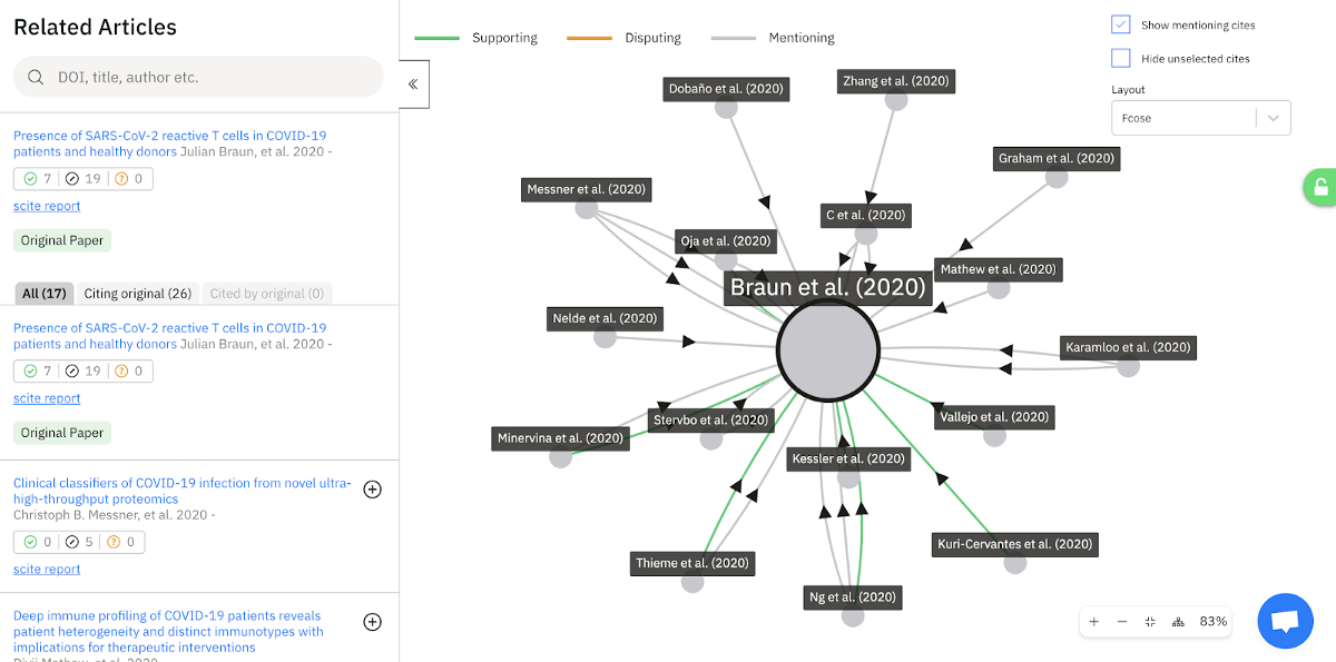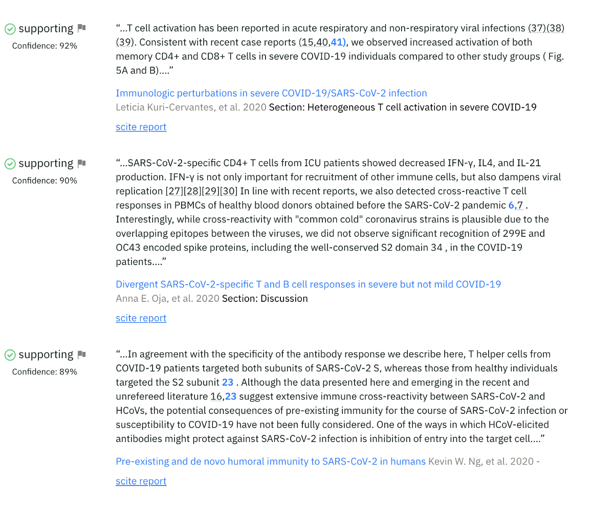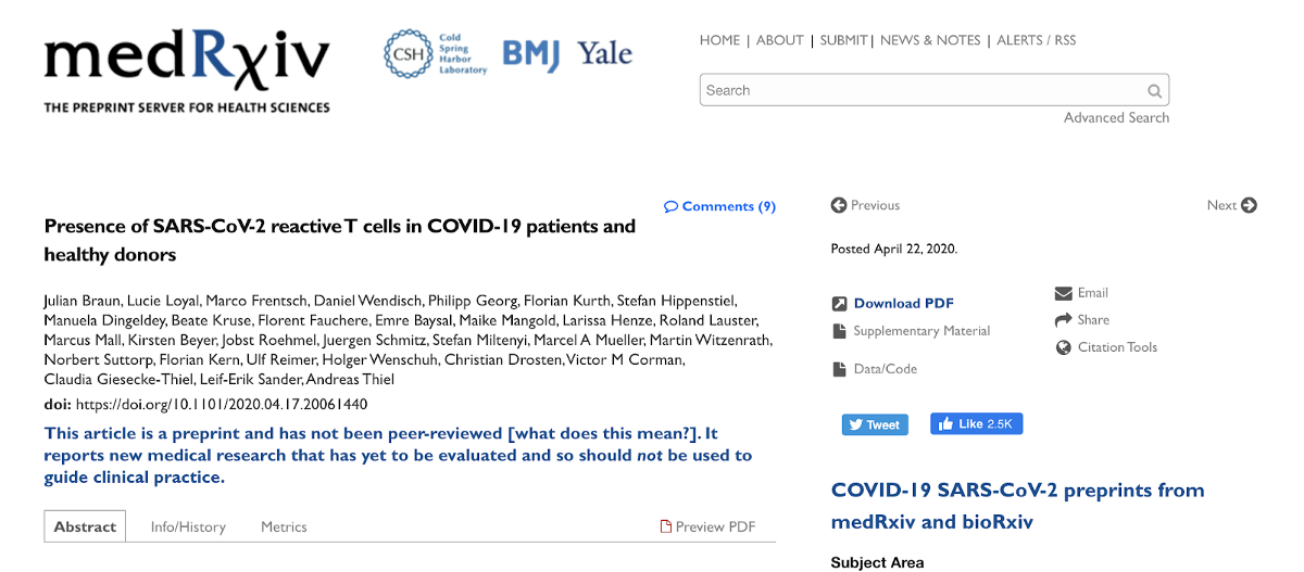 To see how this can help, it’s best to look at the world as it exists without scite and the world as it exists with scite. The preprint, “Presence of SARS-CoV-2 reactive T cells in COVID-19 patients and healthy donors” was posted without peer review on April 22nd on medRxiv, a medical preprint server hosted by BMJ, Yale, and Cold Spring Harbor.