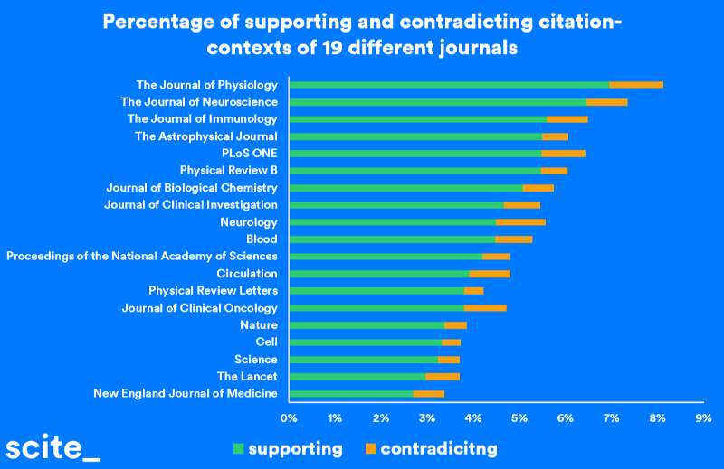 The novelty and the scale of this dataset allow us to finally begin evaluating the quality of citations journals receive, not just the quantity. As a first step, we visualized the incidence of supporting and contradicting citation statements across nineteen different journals.