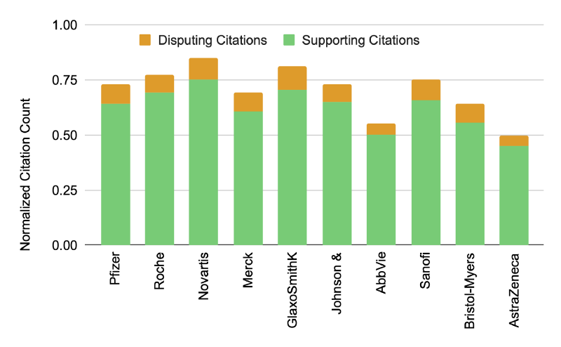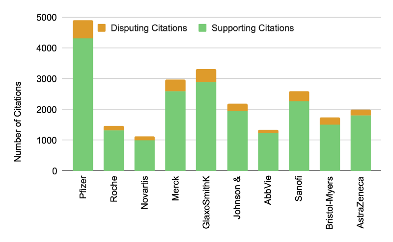 Utilizing our novel data set of over 750M citations from 27M full-text publications we break down the publication records of the top 10 pharma companies below. You can explore all funder dashboards here.